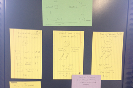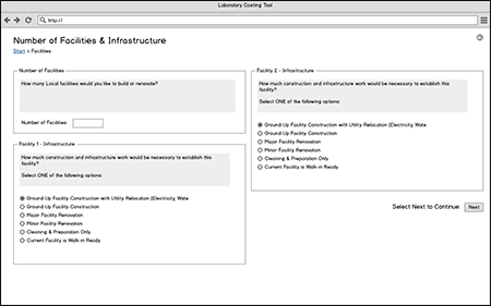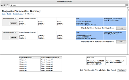 The prototyping phase involved creating UI sketches using balsamiq mockups, focusing on plain-language chocies for the end user and automatically populated costs. These auto-populated costs represent a first estimate for end users, and are later customizable if a particular country or individual has more accurate information.